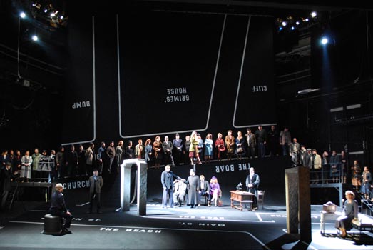 (…) Die Bühne, in der Baesler dieses Geschehen stattfinden lässt, spiegelt weniger die Stimmungen wider, die Brittens musikalische Naturbilder auf die Menschen des Stücks werfen, sondern symbolisiert die zynische Versuchsanordnung einer Gemeinschaft, die den Andersartigen vernichtet: Die in Lars von Triers „Dogville“ auf die Kinoleinwand gebrachte Kargheit der aufgemalten Straßen und Gebäude darf in Andreas Wilkens’ Bühnenbild als Chiffre für die Not des Außenseiters gelten.