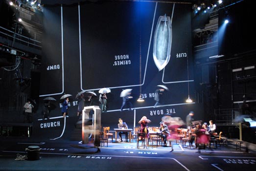 (…) Die Bühne, in der Baesler dieses Geschehen stattfinden lässt, spiegelt weniger die Stimmungen wider, die Brittens musikalische Naturbilder auf die Menschen des Stücks werfen, sondern symbolisiert die zynische Versuchsanordnung einer Gemeinschaft, die den Andersartigen vernichtet: Die in Lars von Triers „Dogville“ auf die Kinoleinwand gebrachte Kargheit der aufgemalten Straßen und Gebäude darf in Andreas Wilkens’ Bühnenbild als Chiffre für die Not des Außenseiters gelten.