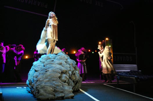 (…) Die Bühne, in der Baesler dieses Geschehen stattfinden lässt, spiegelt weniger die Stimmungen wider, die Brittens musikalische Naturbilder auf die Menschen des Stücks werfen, sondern symbolisiert die zynische Versuchsanordnung einer Gemeinschaft, die den Andersartigen vernichtet: Die in Lars von Triers „Dogville“ auf die Kinoleinwand gebrachte Kargheit der aufgemalten Straßen und Gebäude darf in Andreas Wilkens’ Bühnenbild als Chiffre für die Not des Außenseiters gelten.